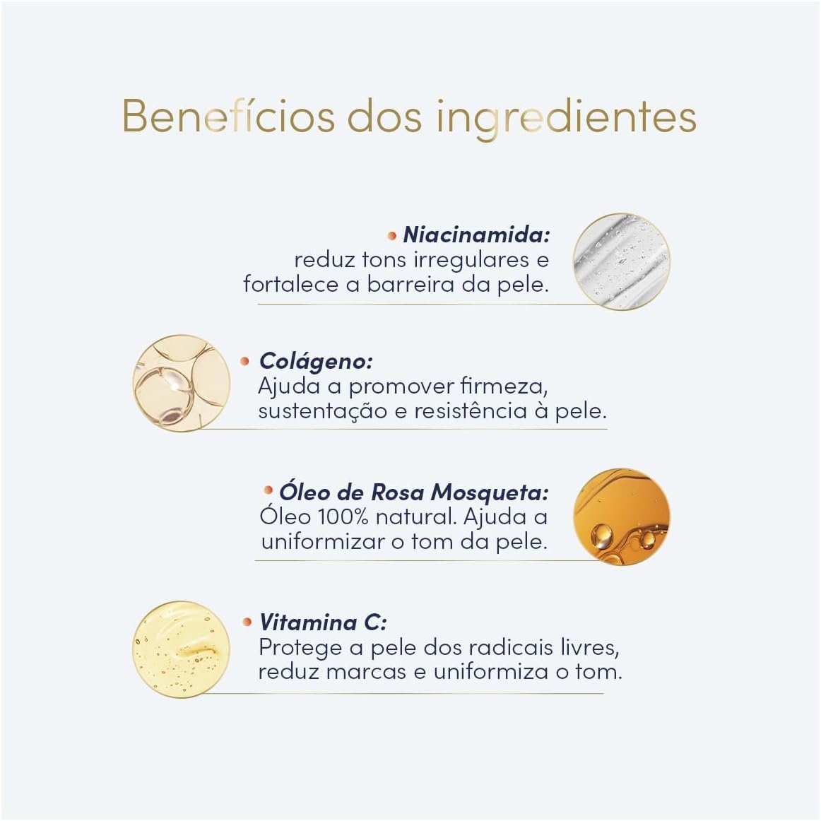 - Fórmula enriquecida com colágeno vegano, vitamina C e óleo de rosa mosqueta