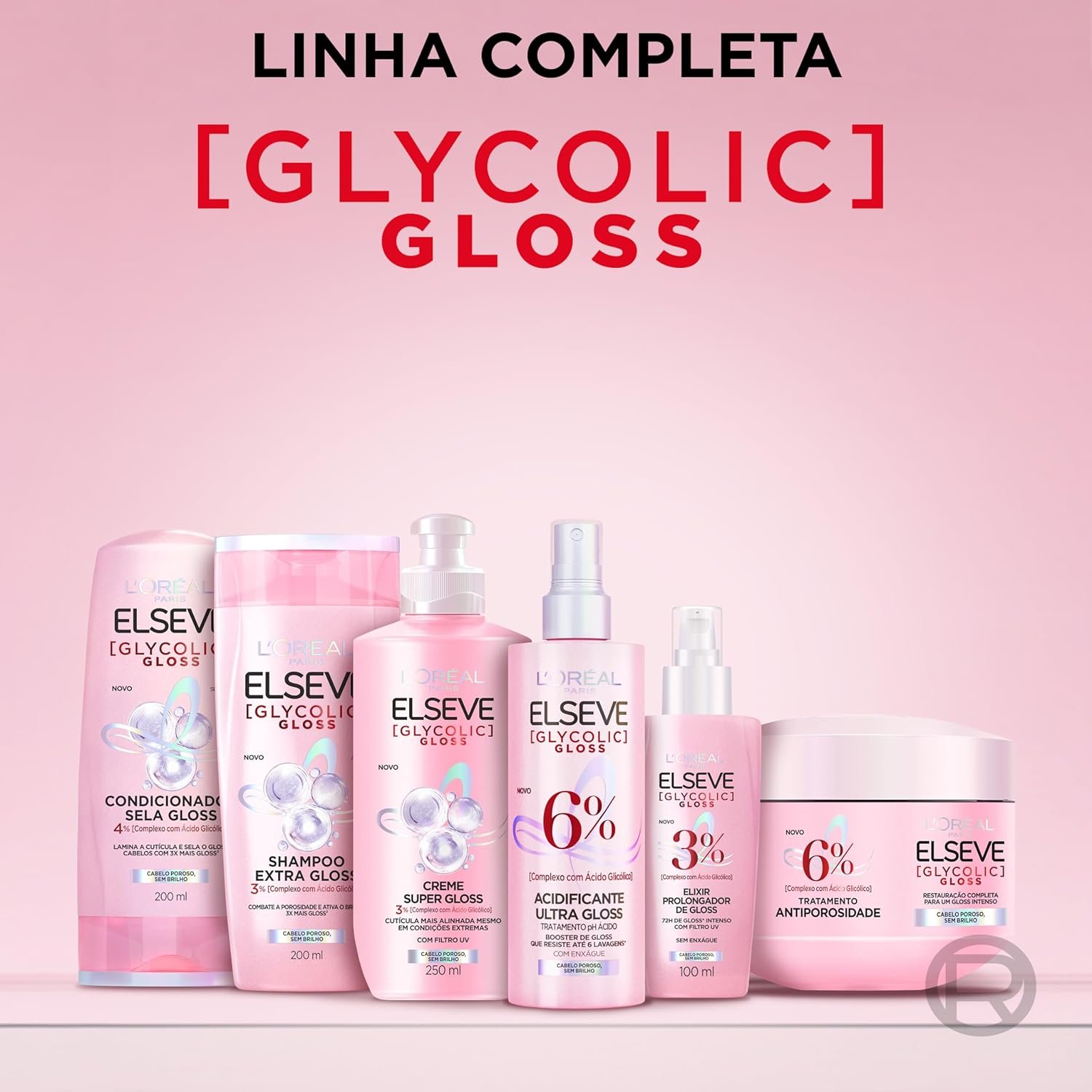 A linha Elseve Glycolic Gloss de L’Oréal Paris garante mais que brilho, ultra gloss que resiste por 6 lavagens. Sua fórmula com pH Ácido rica em Ácido Glicólico, combate a porosidade e sela as cutículas para revelar um cabelo visivelmente saudável e alinhado para um brilho gloss. O Shampoo Extra Gloss, com pH ácido e 3% [Complexo com Ácido Glicólico], promove uma limpeza profunda dos fios e ao mesmo tempo ajuda a combater a porosidade para revelar um cabelo visivelmente saudável e alinhado para um brilho gloss. O Condicionador Sela Gloss, com pH ácido e 4% [Complexo com Ácido Glicólico] desembaraça instantaneamente com dupla ação: – Sela intensamente os fios, preenchendo as falhas da fibra capilar. – Na superfície, lamina a cutícula, alinhando-a para refletir a luz. Cabelo visivelmente saudável e alinhado para um brilho gloss. *Teste instrumental, uso de Shampoo Extra Gloss L’Oréal Paris Elseve Glycolic Gloss vs shampoo clássico. *Teste instrumental, uso de Condicionador Sela Gloss L’Oréal Paris Elseve Glycolic Gloss vs shampoo clássico.