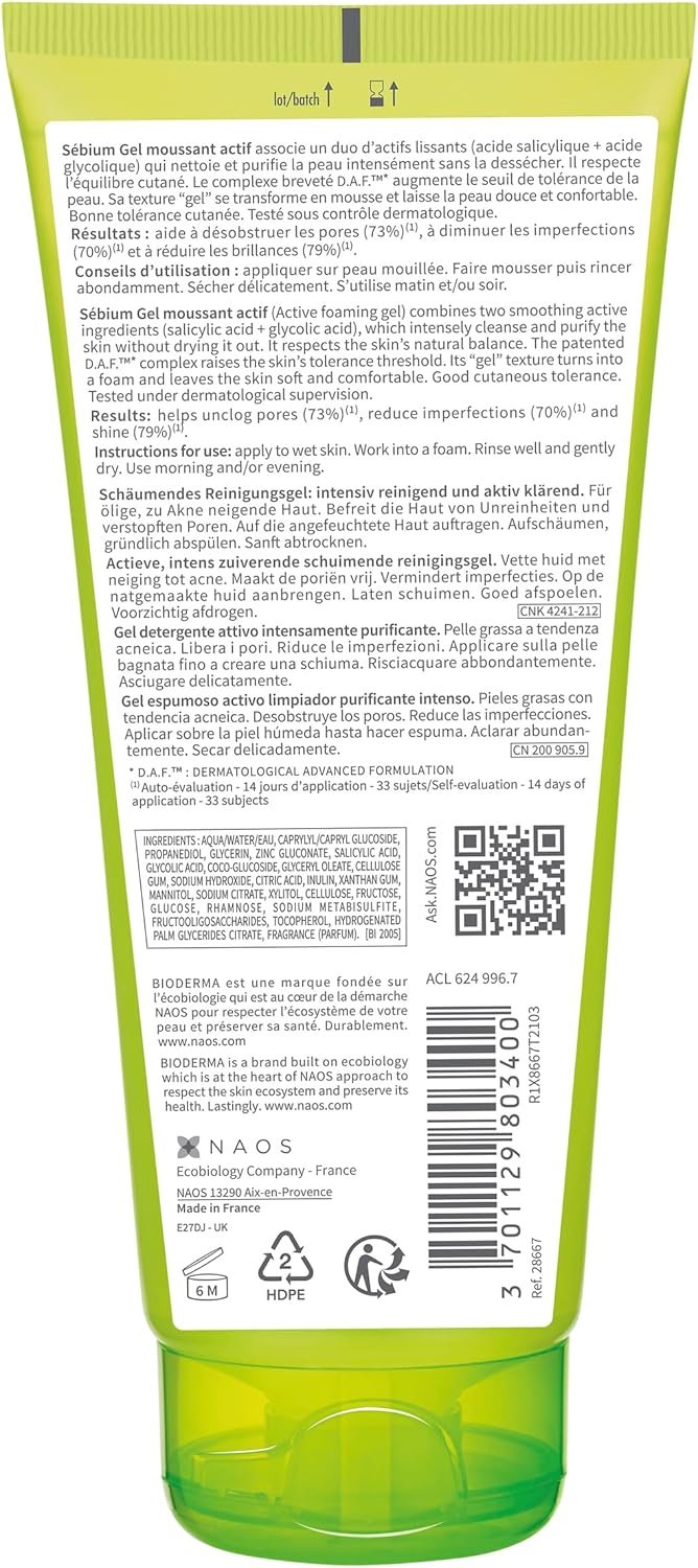 Gel de limpeza facial intensivo, indicado para peles mistas a oleosas e com tendência acneica. A fórmula combina ácido glicólico e ácido salicílico para desobstruir poros e reduzir imperfeições, além de gluconato de zinco para ajudar a controlar a secreção de sebo. O complexo patenteado D.A.F.™ ajuda a aumentar a resistência da pele contra agressões externas. A textura é em gel que se transforma em espuma suave, e o produto é sem sabão, não comedogênico.
